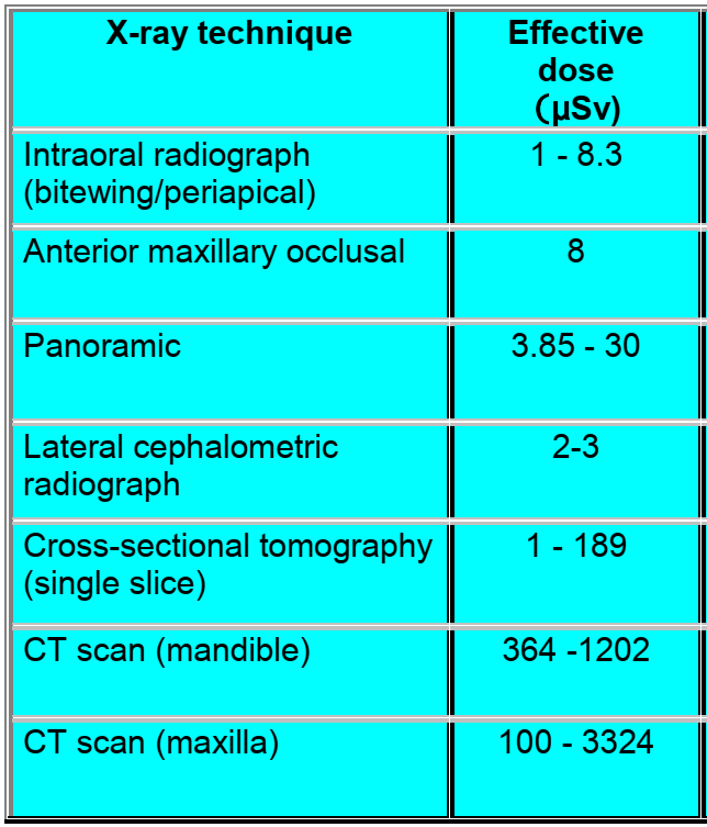 Sabiendo eso, podemos calcular que una radiografía panorámica (considerando las mayores dosis de la tabla anterior) supone la misma radiación que recibimos en menos de 5 días de vida normal. Una intraoral, supone la misma dosis de radiación que se recibe de media por persona en menos de 2 días ¡sin salir de la cama!